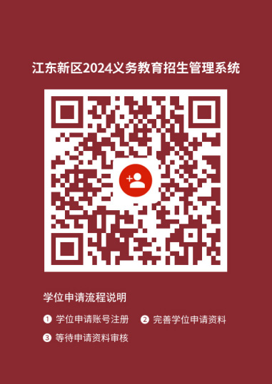 1月20日至24日,登錄“江東新區(qū)義務(wù)教育招生管理系統(tǒng)”(見(jiàn)附件,請(qǐng)掃描二維碼)平臺(tái),按要求上傳學(xué)位申請(qǐng)材料(資料不齊、信息有誤、未按時(shí)申請(qǐng)等情況,將不予安排學(xué)位)。