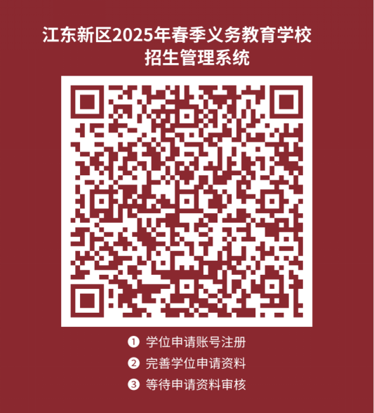 2月5日至8日,登錄“江東新區(qū)義務(wù)教育招生管理系統(tǒng)”(見附件,請掃描二維碼)平臺,按要求上傳學(xué)位申請材料(資料不齊、信息有誤、未按時申請等情況,將不予安排學(xué)位)。