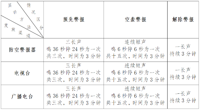 為檢驗(yàn)人民防空警報(bào)設(shè)施性能是否良好,進(jìn)一步增強(qiáng)市民的國防觀念和人防意識(shí),根據(jù)《中華人民共和國人民防空法》有關(guān)規(guī)定和市國防動(dòng)員辦公室國防工作安排,我區(qū)定于9月18日10時(shí)30分至11時(shí)00分進(jìn)行防空警報(bào)試鳴。屆時(shí),防空警報(bào)器將向廣大群眾發(fā)出“預(yù)先警報(bào)”、“空襲警報(bào)”和“解除警報(bào)”三種防空警報(bào)信號(hào),各種信號(hào)鳴放1次(見下表)。望廣大群眾聽(看)到防空警報(bào)信號(hào)時(shí),不要驚慌,注意聽辨,照常工作和活動(dòng)。
